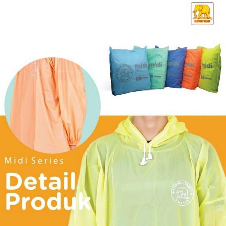 Jas Hujan Ponco Mini elephant Model Terusan Lengan panjang dengan karet di ujung lengan. Panjang Sampai Lutut,Ada penutup kepala dan tali pengerat.(Tanpa celana) Sedikit lebih tebal dari jas hujan merk lain dikelas Ponco yang lain.
