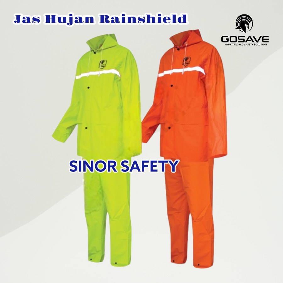 Jas Hujan Safety Gosave Rainshield • Warna : Orange / Hijau • Ukuran : L, XL, XXL • PVC Material • Zipper • Kancing Lock • Hoodie