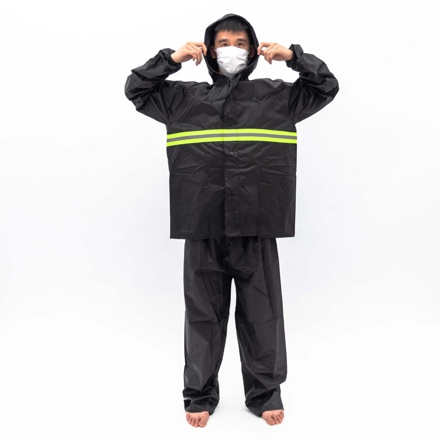 Jas hujan stelan polos dari GRC. Bagian depan dirapatkan dengan menggunakan reseleting dan penutup reseleting berkancing untuk mencegah air masuk kedalam. Ada penutup kepala / hood dan tali pengencang tutup kepala. Karet dibagian pergelangan tangan dan pinggang. Ada scotchlight disekeliling jas hujan. Tidak ada furing. Bagian dalam jahitan dilapisi dengan lapisan anti air agar air tidak meresap masuk melalui lubang jahitan.