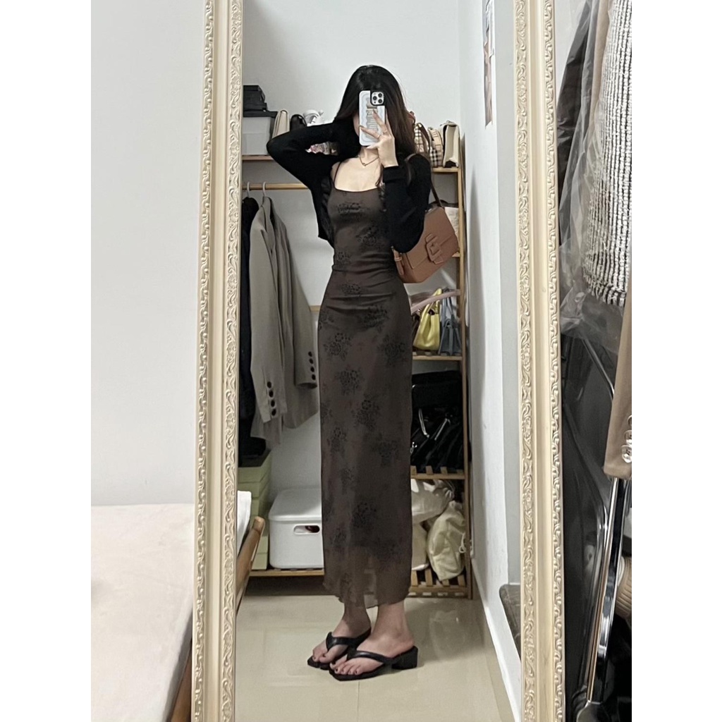 Detail Jas Wanita2023Gaun Tali Pinggang Retro, Gaya Impian Murni Rok Bunga Kardigan Pelindung Matahari