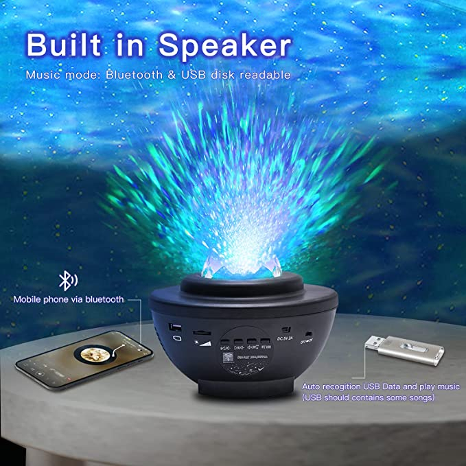 fitur: - Proyektor lampu malam gelombang laut remote control terbaru dengan mode berkedip kontrol suara. - Hidupkan/matikan lampu dengan bebas, - Dapat ubah mode pencahayaan, dan kecerahan - Alihkan efek pencahayaan secara siklis - Dapat sesuaikan volume. - Sensor gerak suara memungkinkan proyeksi berubah warna sesuai dengan irama musik atau tepukan tangan, menciptakan efek disko atau pesta.