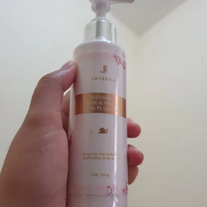 BODY LOTION SERUM JAZEERA SNAIL & SAKURA EXTRACT . Perpaduan Body Lotion & Serum Mewah brand Jazeera, membuat lotion ini berbeda dengan lotion pada umumnya, . Meresap sempurna dengan aroma Bunga Sakura mewah, dengan kandungan serum membuat kulit lebih sehat & bercahaya . MEMBERI PERUBAHAN DALAM SEKALI OLES, WARNA KULIT LEBIH CERAH 1 TINGKAT DARI WARNA KULIT ASLI . ☑️ MANFAAT UTAMA BODY LOTION : - Mampu menutrisi kulit dari dalam - Meratakan warna kulit yang belang akibat paparan sinar matahari - Mencerahkan secara bertahap - Memberi sensi segar /dingin saat dipakai - Melindungi 3x lipat lebih kuat dari sinar UV - Menjaga kelembaban kulit diruang ber-AC / diluar akibat efek buruk polusi udara - Sebagai Antioksidan tinggi untuk kulit - Aroma yang segar Bunga Sakura yang mampu membangkitkan semangat sipemakai - Aroma yang awet & tahan lama seperti parfume . Lotion ini Tidak untuk wajah, disarankan pemakaian setelah mandi, tekstur lebih meresap & aroma lebih tahan lama