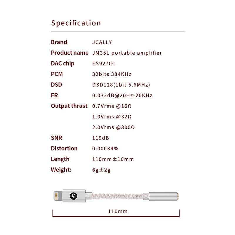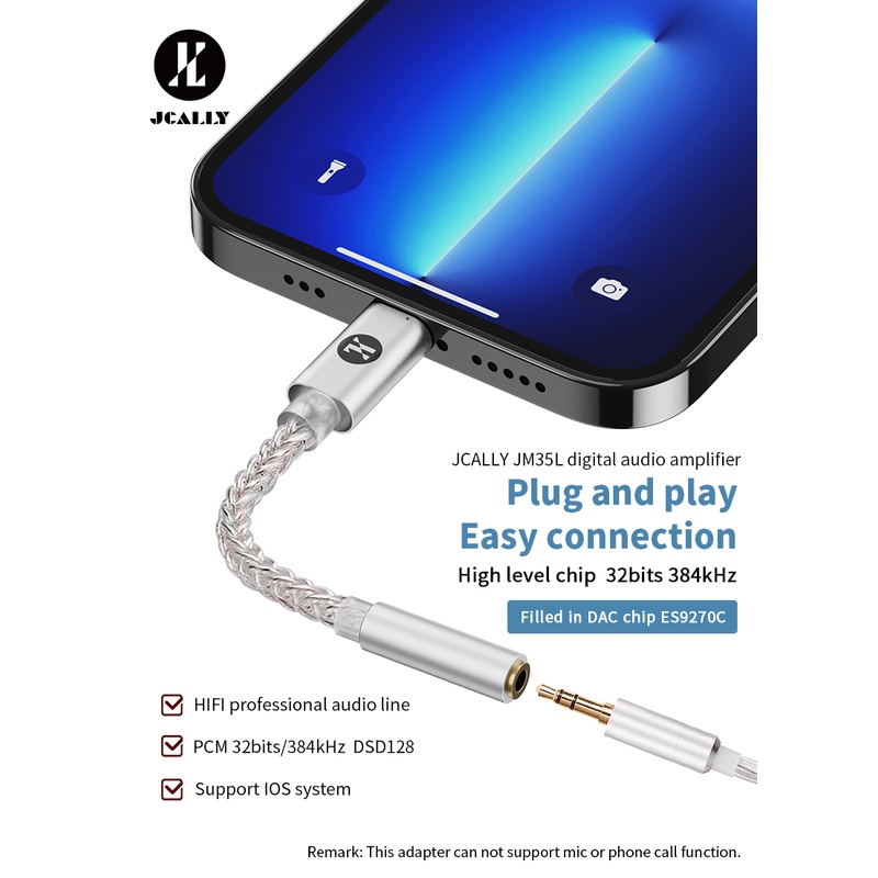 JCALLY JM35L adalah Dongle yang didesain khusus untuk perangkat apple yang menggunakan lightning connector. Dongle menggunakan chip perfoma tinggi dari ESS yaitu ES9270C yang mampu menghasilkan suara berkualitas tinggi yang bebas distorsi.
