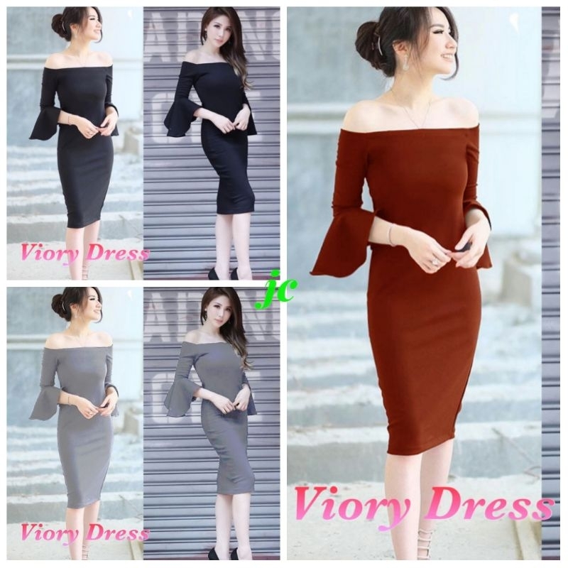 Dress model sabrina dengan tangan terompet, bahan spandek import, ld 89 pjg 87cm (bawah lutut)