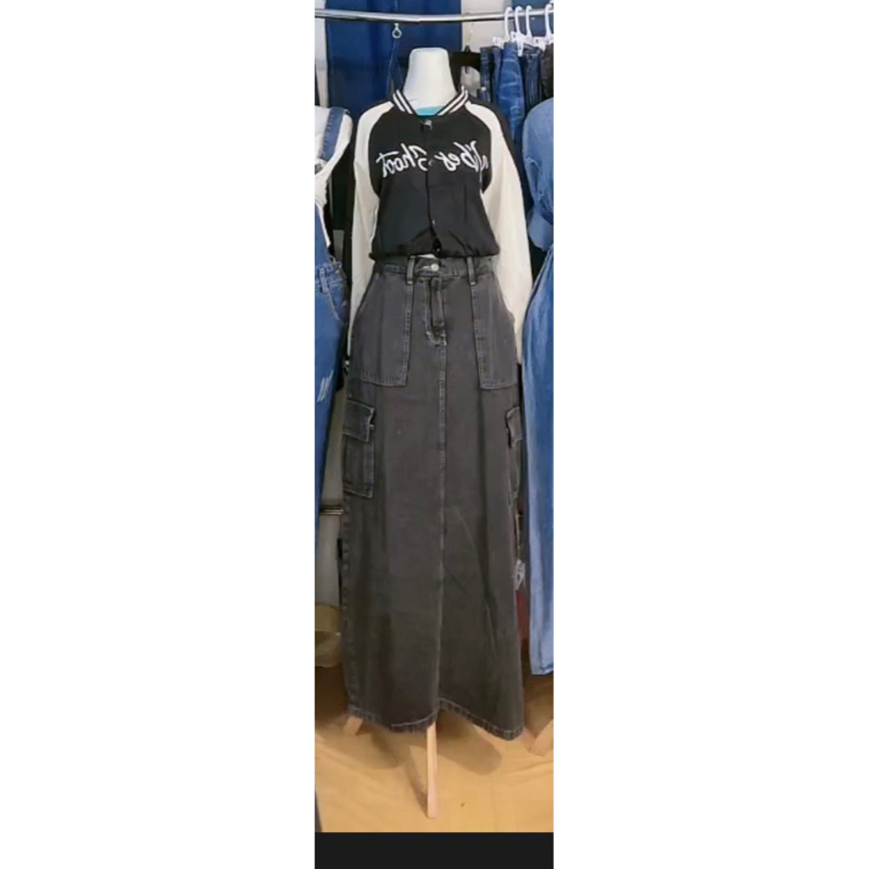 Detail jeans hijab longdress denim setrok kargo