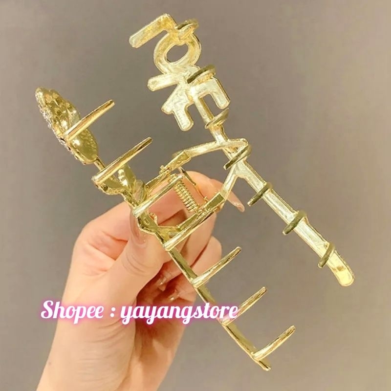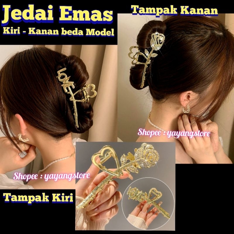 ready Jedai / Jepit Rambut Besar Wanita 2 sisi : *Sebelah tampak Bunga Mawar dengan tangkainya ( dilengkapi Batu Permata ) *Sebelah tampak tulisan LOVE *warna : gold *Material : Logam ( bukan plastik ) *size : 11.5 * 4 cm *sangat mewah dan elegan digunakan. *bersinar ( blink blink ) saat terkena cahaya *harga perpcs