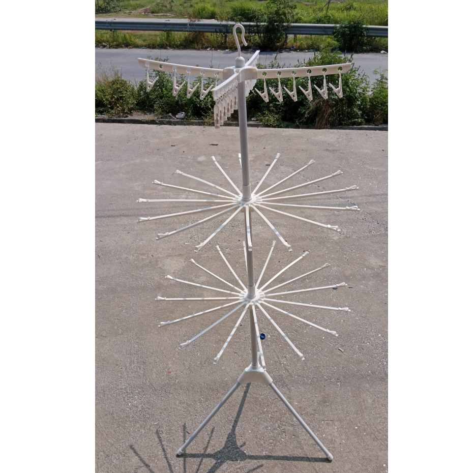 Keunggulan: 1. Menggantung sampai 32 baju 2. 3 tingkat jemuran 3. Penjepit pada batang jemuran 4. Lubang untuk gantungan baju 5. Bisa dilepas per tingkatnya 6. Bisa diputar
