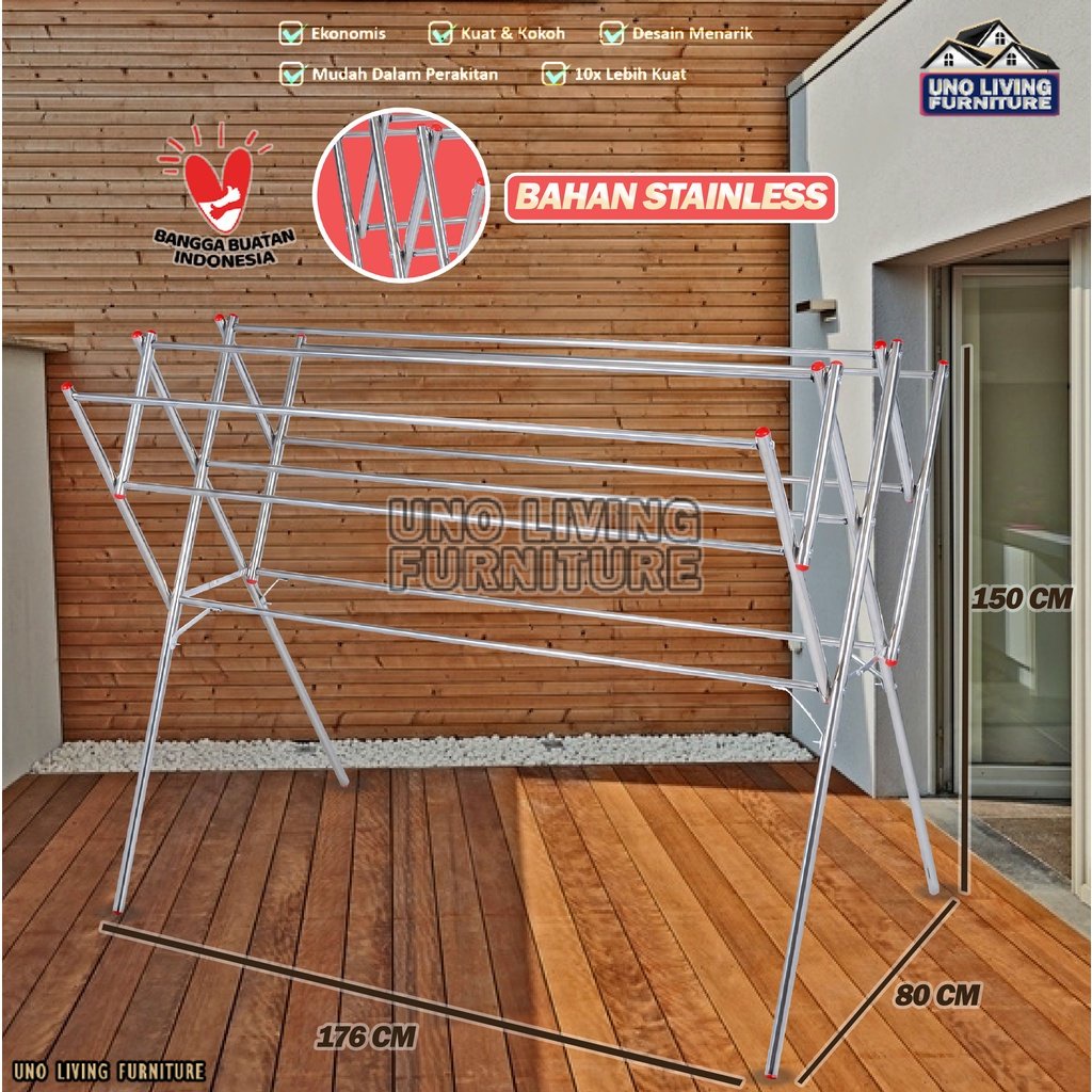 Terbuat dari 100% stainless steel yang kuat dan dijamin anti karat. Jemuran stainless steel ini memiliki beberapa keunggulan dibandingkan dengan bahan aluminium, antara lain : - 100% Stainless Steel ASLI bukan besi chrome - bahannya lebih keras & kuat, - Anti Karat - lebih berat sehingga tidak rubuh ditiup angin -palangan tebal tidak melengkung saat menjemur pakaian yang berat - penampilan yang mewah dan elegant -sistem knockdown packing ringkas - pipa bulat ujungnya rapi tidak tajam - mudah dipasang ada kertas petunjuknya.