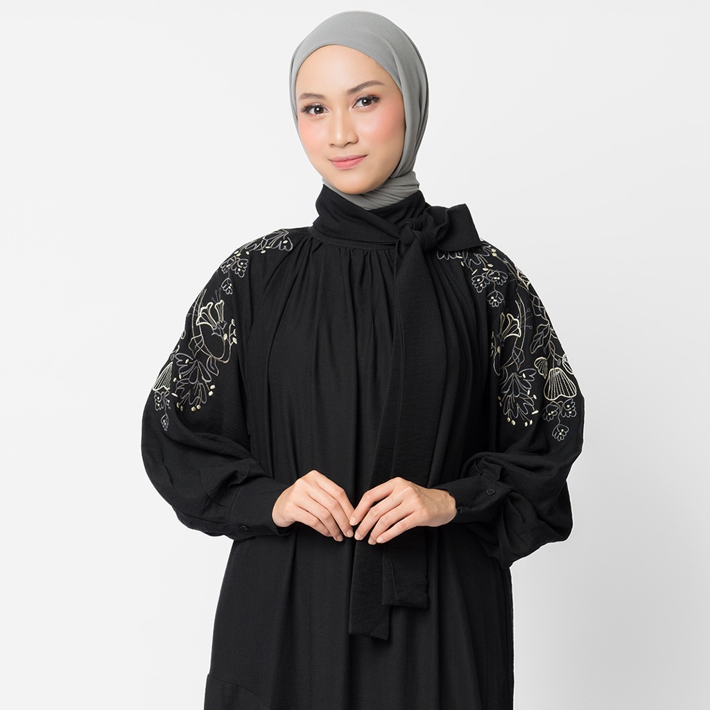 - Dress panjang dengan aksen pita dibagian depan. - Memiliki siluet A dan pola lengan raglan sehingga memberikan ruang lebih pada bagian tersebut. - Dress ini memberikan tampilan yang rapi dan elegan sehingga dapat digunakan untuk acara formal.
