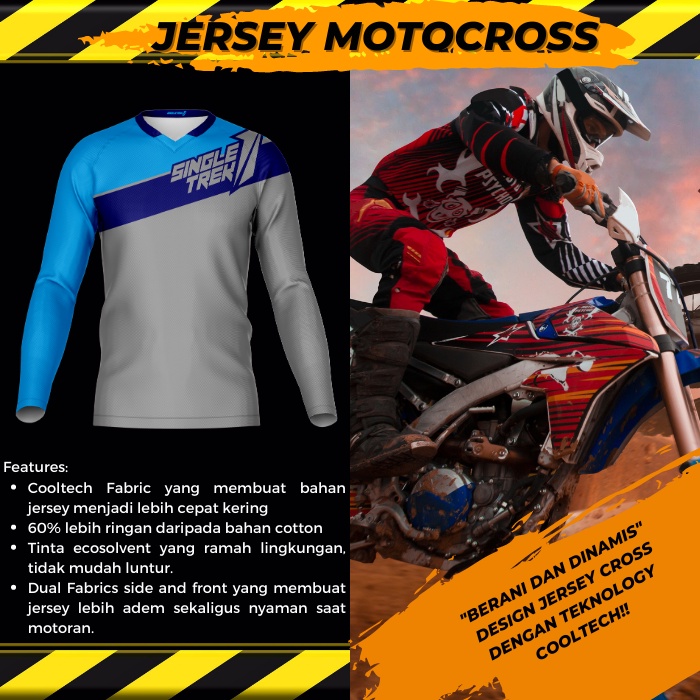 "Jersey Motor Cross Cooltech memiliki spesifikasi yang luar biasa. Terbuat dari bahan Cooltech yang menjamin kenyamanan dan perlindungan selama berkendara. Desain aerodinamis membantu mengurangi gesekan dengan udara dan mempercepat pendinginan. Serta memiliki sistem penyerapan keringat yang efektif membuat Anda tetap kering sepanjang waktu. Cocok untuk para pecinta motor cross yang ingin tampil stylish serta Jersey motocross ini juga memiliki fitur tambahan seperti sistem ventilasi untuk membuat pemakaian lebih nyaman dan membantu menjaga kondisi tubuh pembalap saat berkendara''.