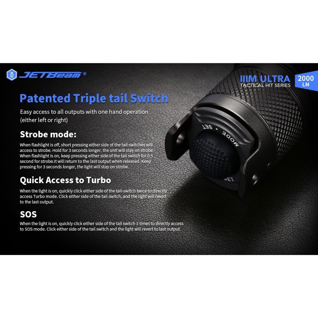 Kemudahan Akses Mode JETBeam merancang senternya dengan konsep triple tail switch yang dipatenkan. Konsep ini memudahkan Anda mengaktifkan 3 mode hanya dengan menekan tombol yang ada di bagian ekor senter. 3 Mode yang dapat diakses meliputi mode strobe, turbo, dan SOS. Pengaturan lebih detail dapat Anda lihat melalui buku panduan.