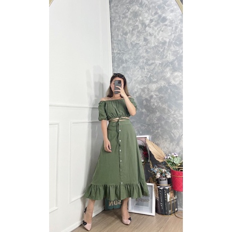 Bahan Cotton Linen HQ - Freesize - Top : LD :88 - 108cm ( full karet bagian dada, pundak, dan pinggamg ) L.Lengan 48cm ( ada karet ), P: 34cm, ada tali lilit di bagian pinggang tidak bisa di lepas (bisa di pakai model biasa ataupun off shoulder), Midi Skirt : L. Pinggang 62-84cm ( ada karet ), L.Pinggul upto 114cm, P: 80cm, full kancing hidup di bagian depan rok, bisa di pakai terpisah