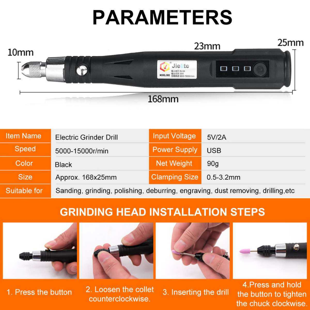 Penggunaan yang Mudah Tak perlu membeli baterai, Anda hanya perlu menghubungkan bor mini ini ke sumber daya dengan port USB. Anda dapat menyalakan alat setelah mata bor terpasang. Mata bor juga mudah dilepas dan dipasang sesuai dengan kebutuhan Anda.