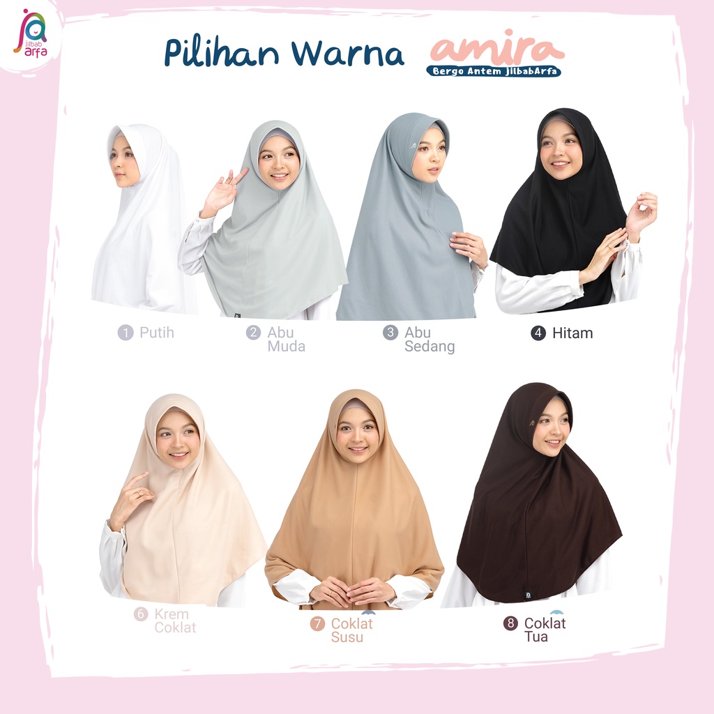 Jilbab AMIRA (Bergo Antem Jilbab Afra) Jilbab instan dengan pet / topi anti tembem berbahan kaos adeem, lembut, nyaman, tidak mudah berudul.