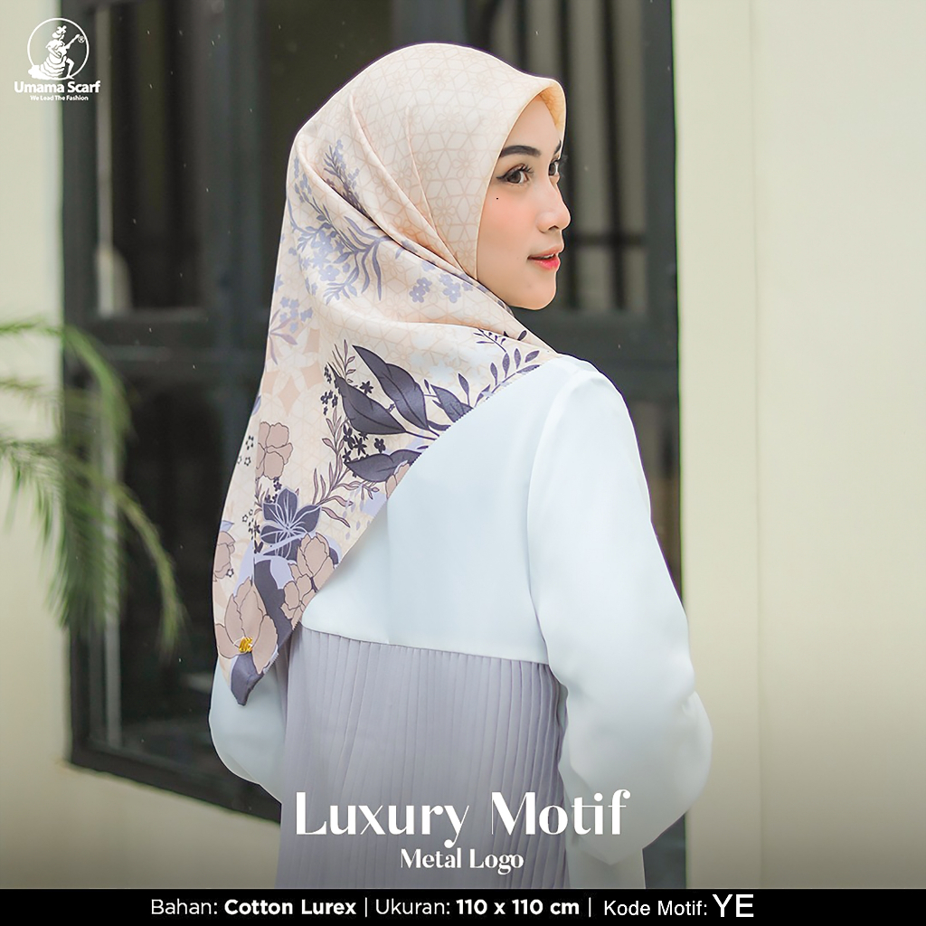 Detail Jilbab Segiempat LUXURY PRINT UMAMA kode YE motif bahan Cotton Lurex original