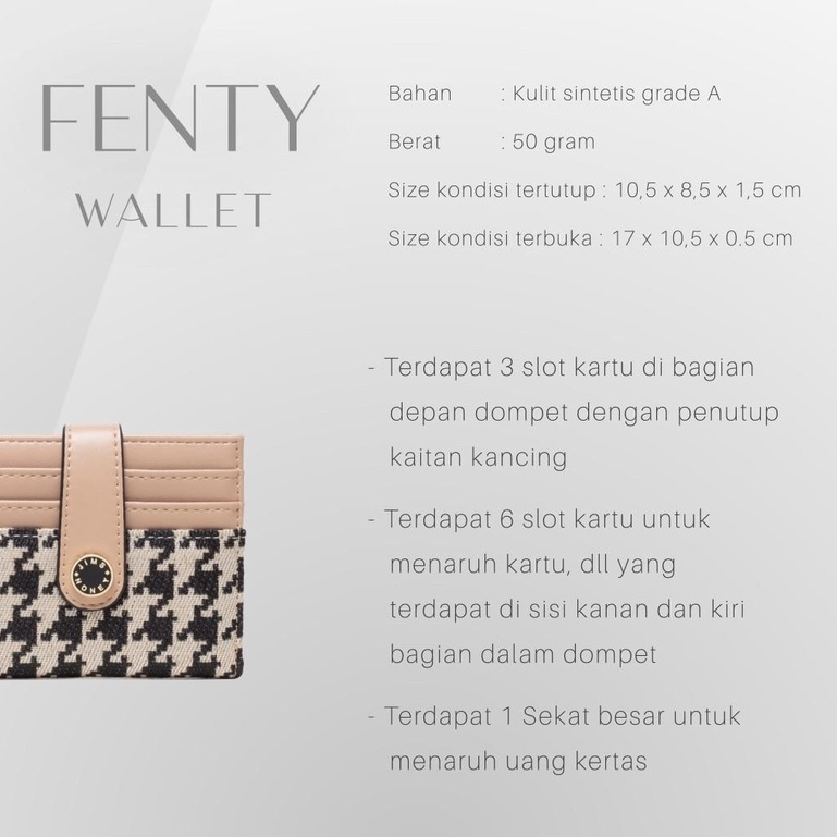 Fenty Wallet memiliki 1 kompartmen besar untuk cash serta 9 pocket untuk kartu sehingga sangat fleksibel untuk dibawa✨ Keuntungan memiliki dompet kecil, sangat mudah untuk dibawa ke dalam mini bag dan praktis.