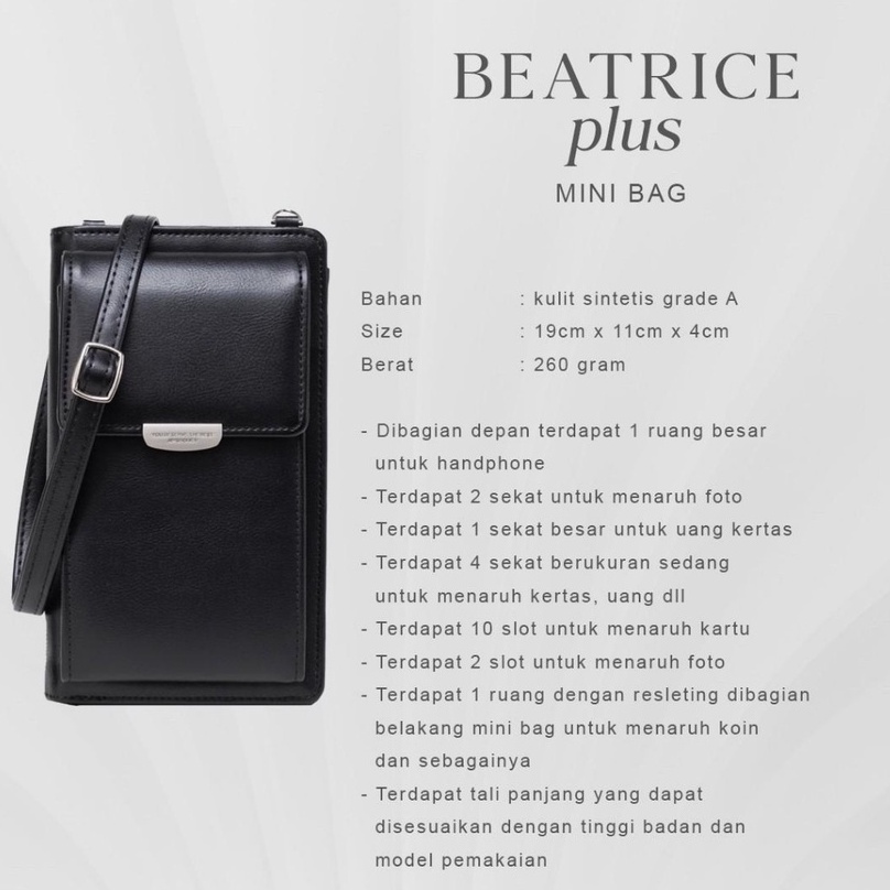 Beatrice Plus memiliki segudang fungsionalitas yang luar biasa. Bisa untuk dompet ataupun mini bag. Memiliki tali panjang sehingga dapat digunakan sebagai tas selempang (sling bag), dengan bahan kulit sintetis, sudah pasti Beatrice bag wajib kamu miliki . So, what are you waiting for, ladies? go get your now 🙂