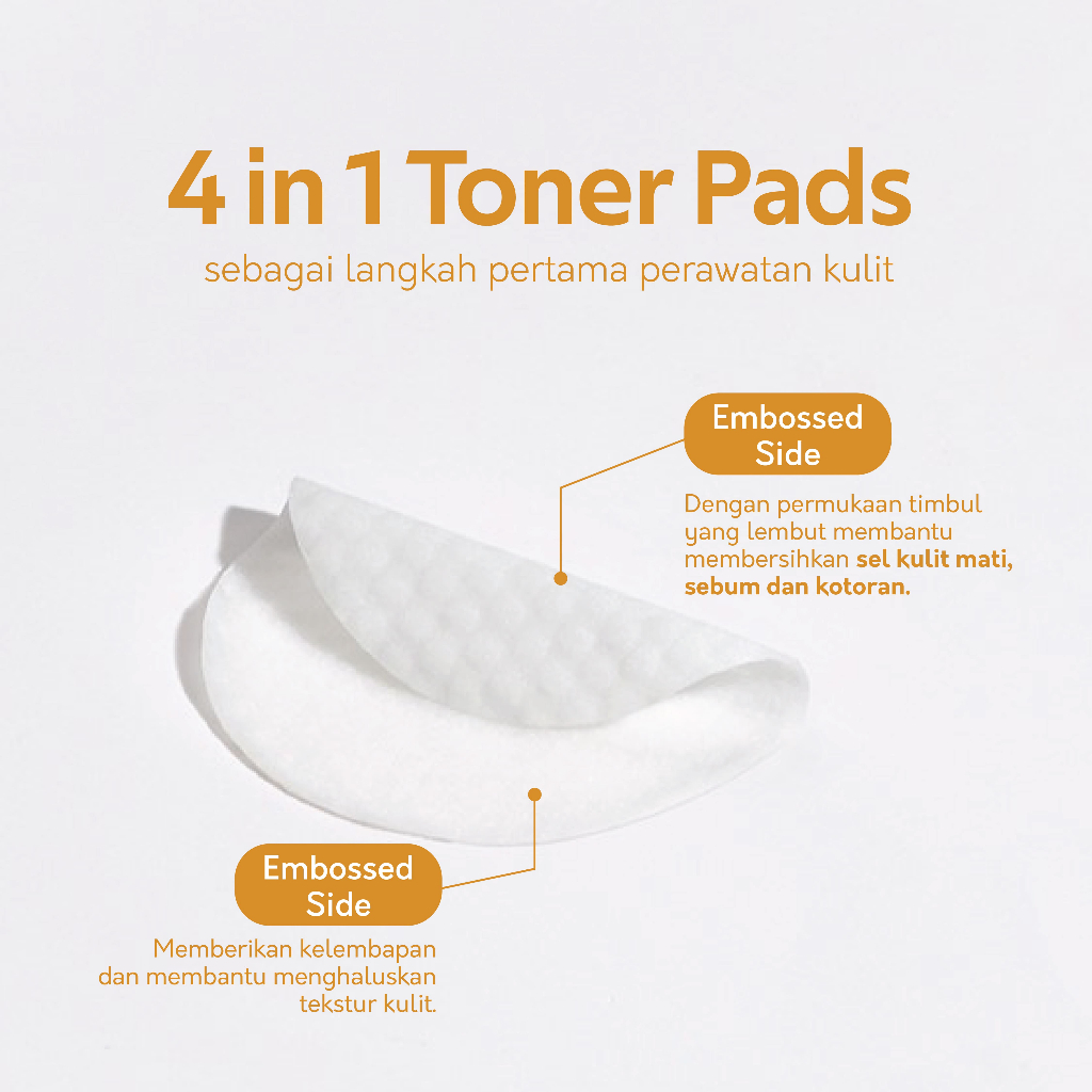Cara Pakai: Ambil selembar toner, usap perlahan sisi emboss pad ke seluruh wajah kecuali area mata. kemudian Usap wajah sekali lagi menggunakan sisi pad lainnya secara perlahan. __