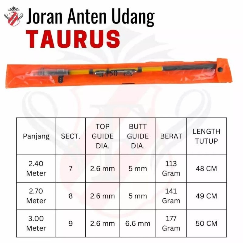 Keterangan Ukuran : Panjang SECT. TOP GUIDE DIA. BUTT GUIDE DIA. BERAT LENGTH TUTUP 1.50 Meter 5 2.6 mm 3.75 mm 69 Gram 46 CM 1.80 Meter 5 2.6 mm 3.75 mm 70 Gram 46 CM 2.10 Meter 6 2.6 mm 5 mm 88 Gram 48 CM 2.40 Meter 7 2.6 mm 5 mm 113 Gram 48 CM 2.70 Meter 8 2.6 mm 5 mm 141 Gram 49 CM 3.00 Meter 9 2.6 mm 6.6 mm 177 Gram 50 CM