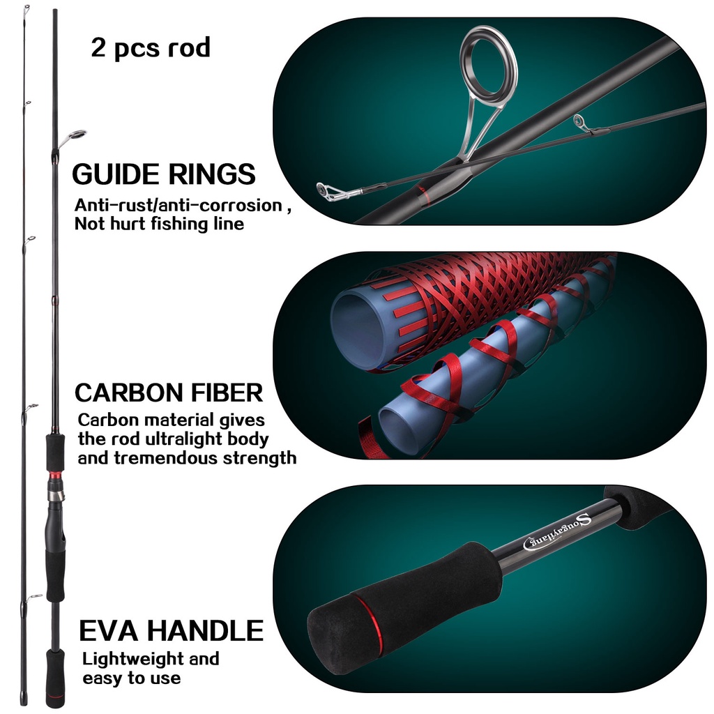 Pancing Jenis: Spining Warna Hitam Panjang: 1.8m / 2.1m Menangani: Pegangan EVA Pegangan anti selip, nyaman dan tahan lama