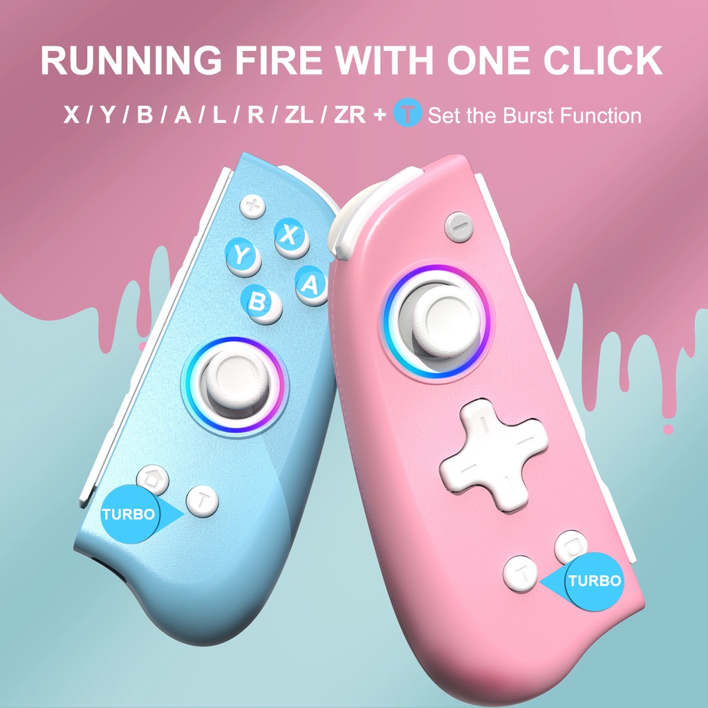 - This product is a brand-new function wireless Joy Con, compatible with Switch / OLED / Lite - There is no need to load any driver. - Use Bluetooth wireless to connect, with strong anti-interference ability, free control, and stable connection signal. - The ergonomic design and lightweight handle structure make the player feel comfortable - This handle supports gyroscope axis function and enhance somatosensory vibration motor - 8 Colors breathing LED - Turbo Function - Battery 600 MAH - Material : High Quality ABS