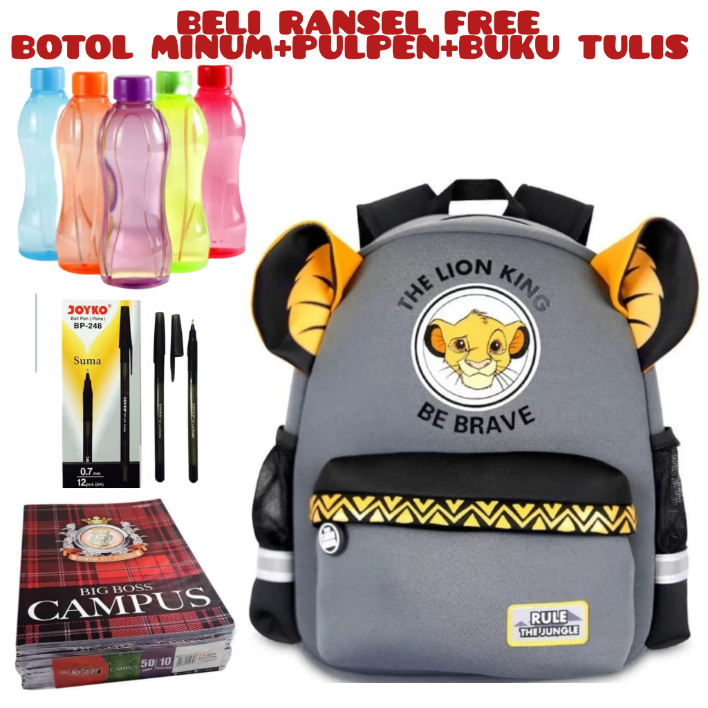 JS_Beli 1 Dapat 4 -Tas Ransel Sekolah Anak Laki-laki Disney Simba The Lion King Tas Sekolah Anak Perempuan Karakter Beli Ransel Free Botol Minum+Pulpen+Buku Tulis