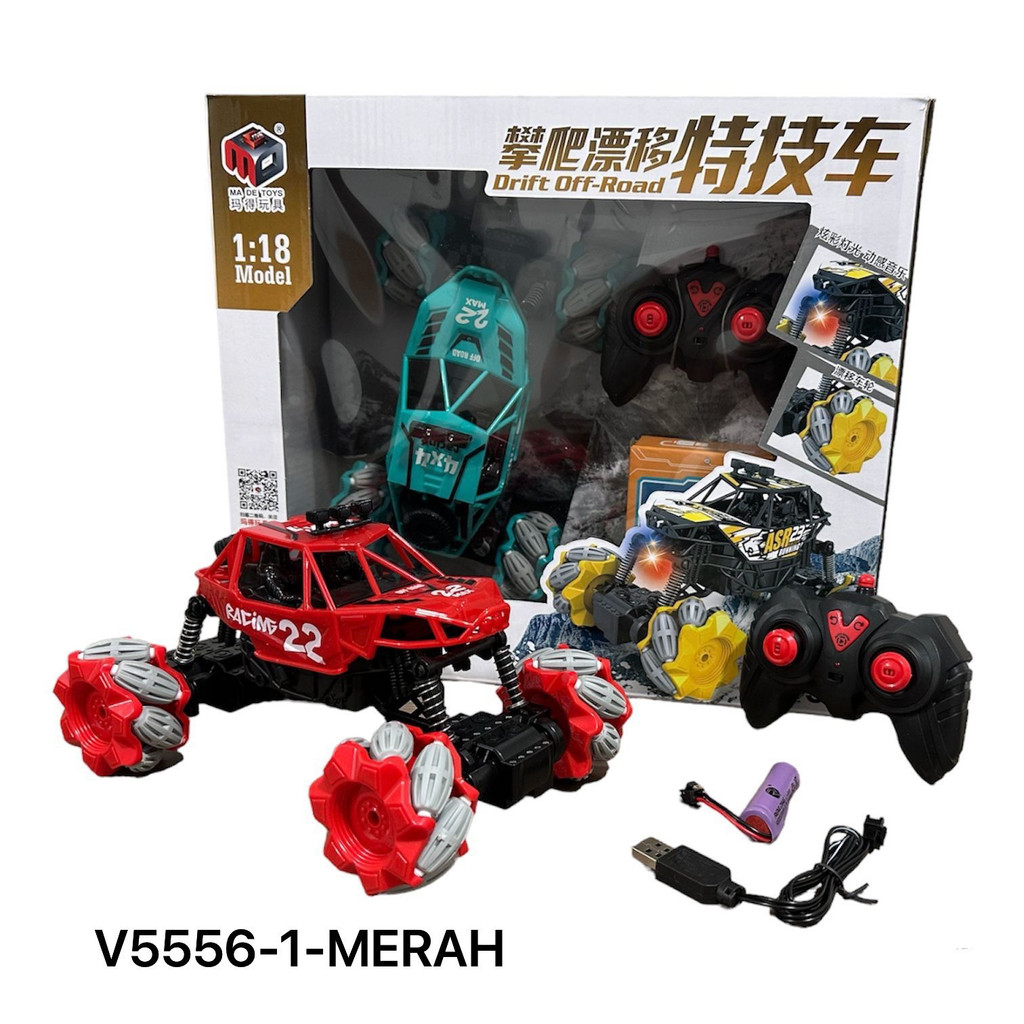 Mainan mobil remot dengan design 4 roda yang besar, sehingga tetap bisa dimainkan diberbagai permukaan (rata/tidak rata) Badan mobil menggunakan per sehingga elastis dan tidak mudah rusak jika terjadi benturan