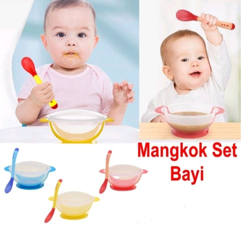 Ibu & Bayi > Peralatan & Aksesoris Makan > Peralatan Makan Bayi > JT - Mangkok + Sendok + Tutup Mangkok Makan Bayi Sensor Panas Mangkuk Tempat Makan Bayi Anti Tumpah Suction Bowl Anti Slip