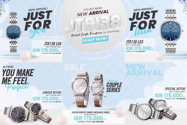 PERFECT FOR YOU AND FOR HIM! introducing Jims Honey Timepiece 8138 - couple series . Jam tangan terbaik untuk kamu dan si dia. Dengan strap stainless yang kokoh dan mewah, memberikan tingkat durabilitas yang tinggi pada Jims Honey timepiece 8138 . It's perfect for you and for him, so go get yours now and get one for him too. Jam tangan couple-an . Price : 250 K SALE 30% menjadi 175 K