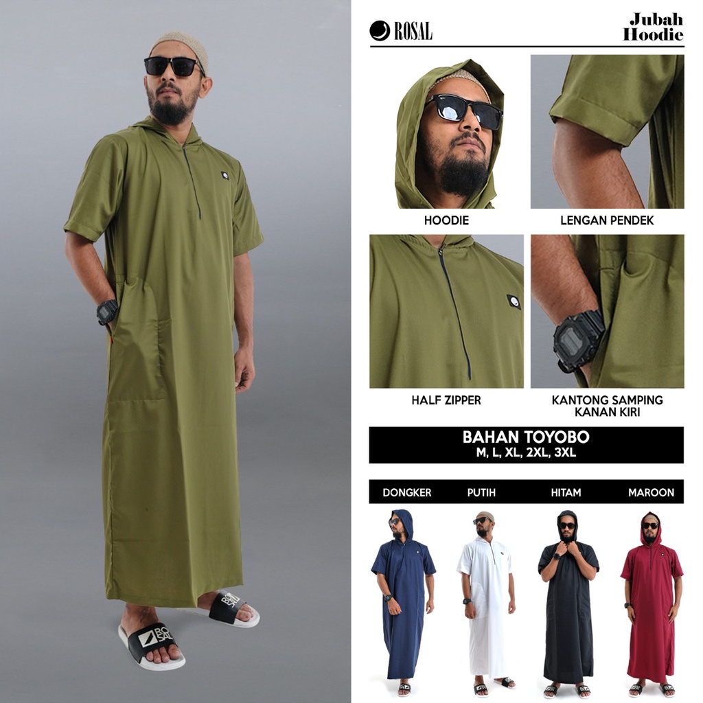 Jubah Hoodie menggunakan material Toyobo, dengan varian warna khas ala rosal, tanpa banyak aksesoris. Sehingga nyaman digunakan karena tidak mencolok dan memancing perhatian orang.