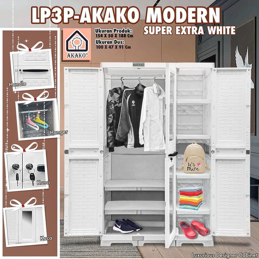 Detail JUMBO LEMARI PLASTIK AKAKO ELEGANT 3 PINTU KACA LP3EP MODERN LP3P MODERN LEMARI GANTUNG KACA FULL KUNCI LEMARI PAKAIAN MODERN
