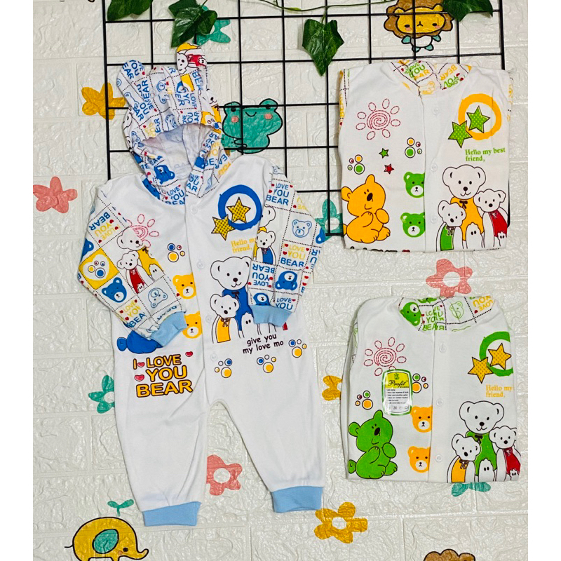 baju jumper buka kaki untuk usia 0-3 bulan dengan motif karakter beruang lucu bahan halus dan tidak panas saat di pakai variasi warna : biru hijau kuning