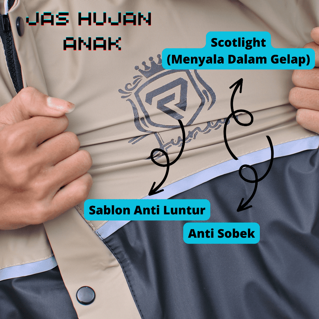- Jas hujan Anak setelan jaket hoodie dan celana - Desain Fungsional,KERAH LEBIH TINGGI (TURTLENECK) guna untuk menghalangi air dari area leher - Resleting Zipper full waterproof - Pergelangan tangan dan pinggang bisa di menyesuaikan - Bahan PVC 0,25 best quality,tebal,halus dan elastis - Tidak panas - Tidak mudah sobek - Bahan waterproof dan windproof - Sistem jahit double &(SEALED HOTPRESS) - Kombinasi SCOTLIGHT police (bersinar waktu berkendara di malam hari.