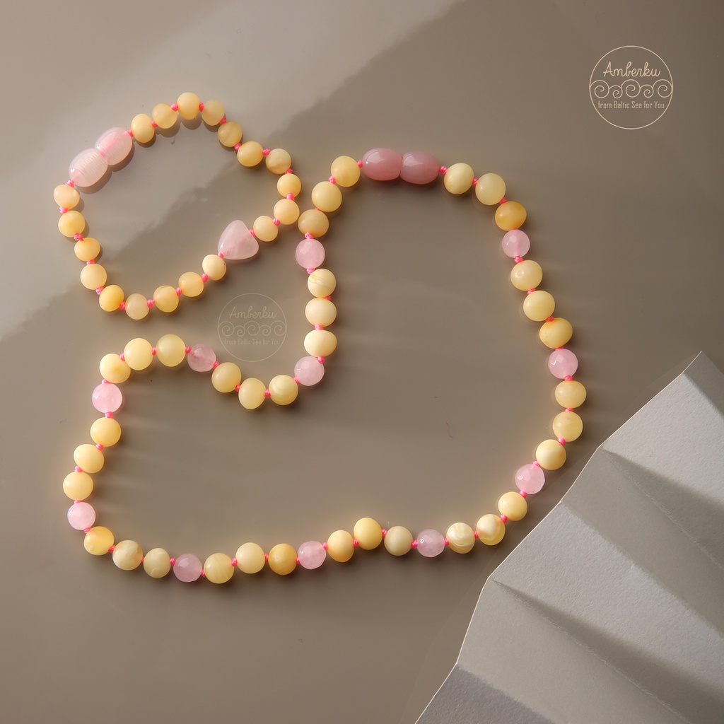NEW ARRIVAL #Amberku mempersembahkan #kalungamber untuk #tumbuhgigi balita kombinasi dengan gemstones ROSE QUARTZ, 100% amber Baltic dari Lithuania. Butiran amber roundies (bulat sekali).