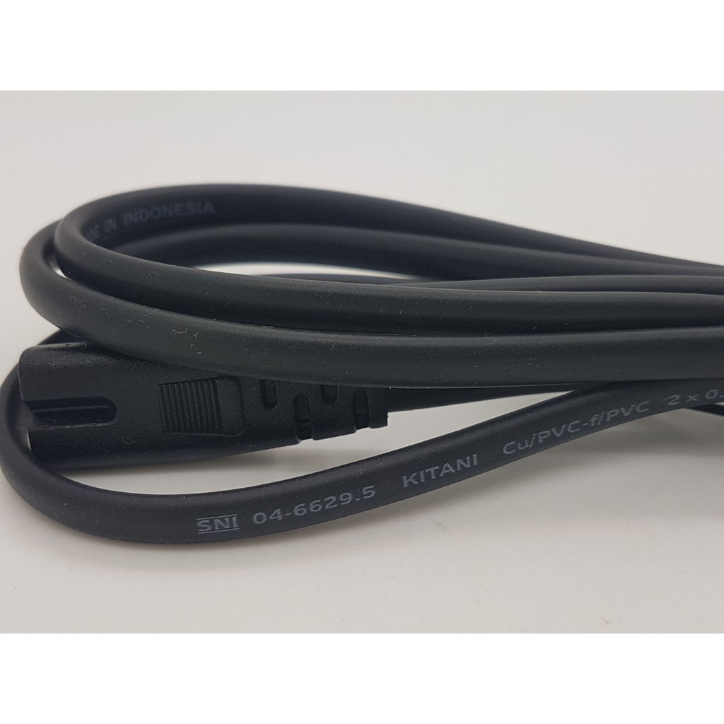 kabel ac power AC Cord angka 8 gepeng / oval merk KITANI. panjang kabel 2 meter, ukuran kabel 0,75mm2. biasa digunakan buat mengganti kabel2 listrik yg rusak terdapat 23 serabut tembaga murni. Maksimal 10A ( 2200watt ).