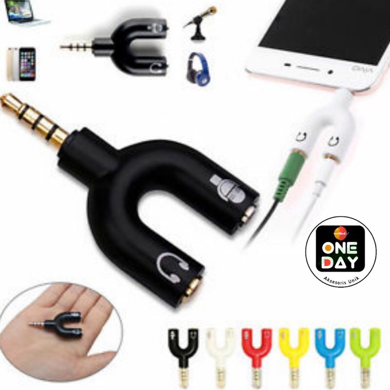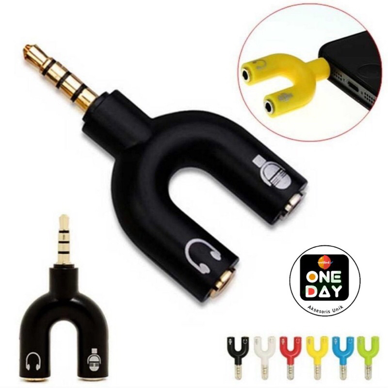 Produk: Audio Splitter Model U (Microphone & Earphone) Tipe: Jack 3.5 mm Warna: Hitam / Biru / Merah / Hijau Jumlah: 1 pc