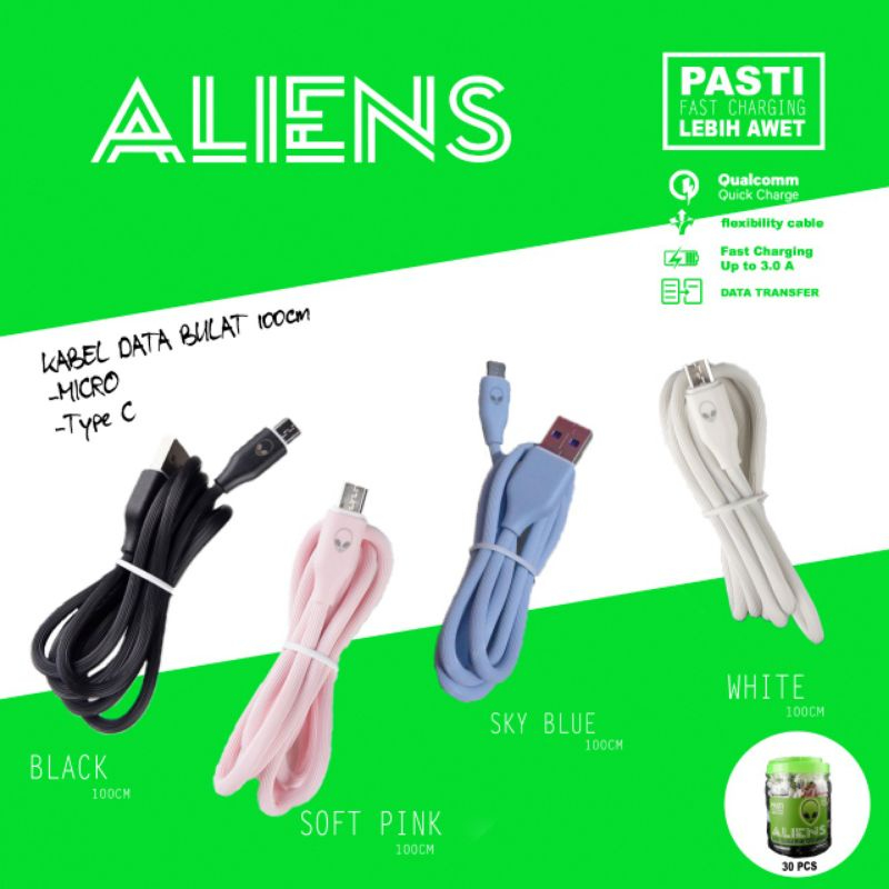 Detail Kabel Data ALIENS TOPLESAN MICRO DAN TYPE C ISI 30 PCS 100 CM FAST CHARGING CABLE DATA ALIENS