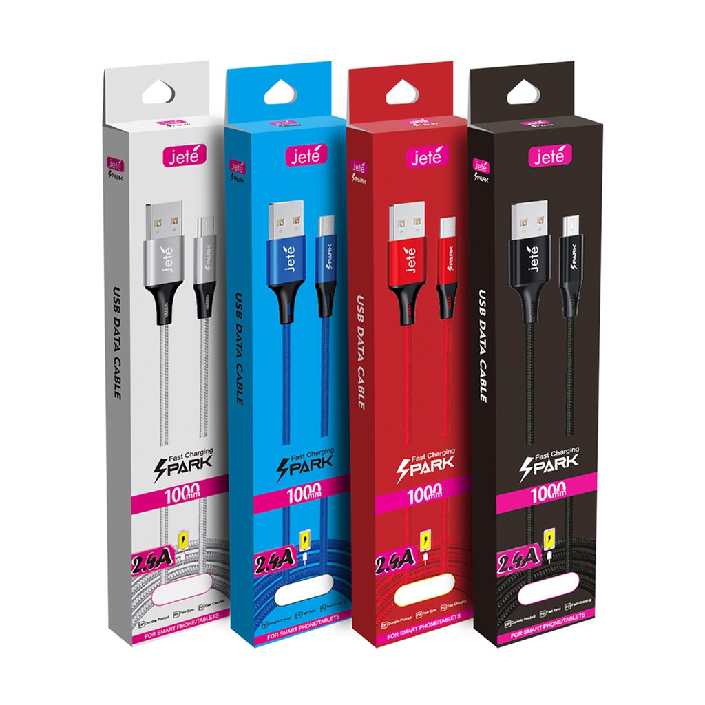 Merk : Jete Model : Spark Output : 2.4A Panjang Kabel : 100cm Warna : Putih, Biru, Merah, Hitam Tersedia type : Iphone, Micro, Type-c