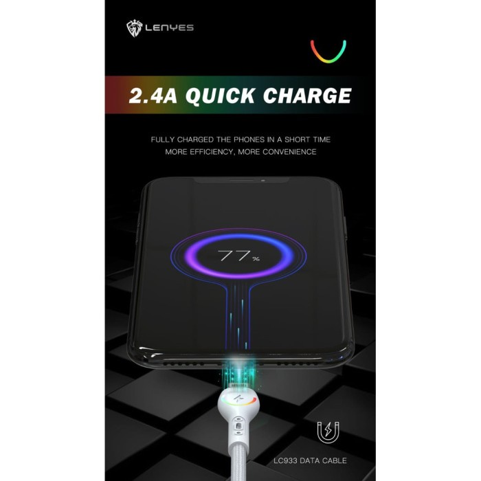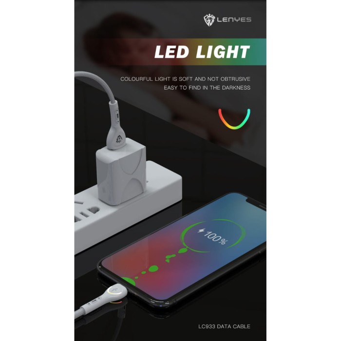 LENYES FAST CHARGING DATA CABLE LC933 *dengan adanya lampu pada kabel, Anda tidak akan kesulitan menemukan device anda yang sedang di charging ketika keadaan ruangan gelap. **model nylon seperti tali sepatu ***ada lampu LED warna warni yang bisa berubah warna otomatis (hanya variasi bukan indikator)