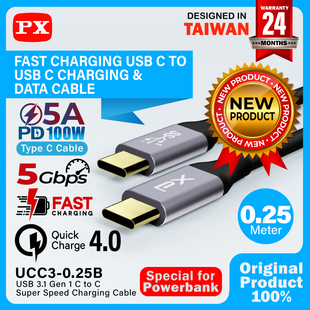 SPESIFIKASI Merek : PX Model Produk : UCC3-0.25B Material : Gold Plated + Nylon + Aluminum Alloy Output : 5V@5A Kecepatan Transmisi : 5 Gbps Kompatibel : Perangkat dengan port Type C Warna : Hitam Panjang : 0.25m