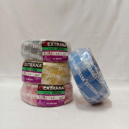 Kabel NYA Merek Extrana ukuran 1x1,5 mm 1 Roll memiliki panjang 50 Meter Berkualitas Warna Bervariasi Tembaga Murni Tersertifikasi Standard Nasional Indonesia