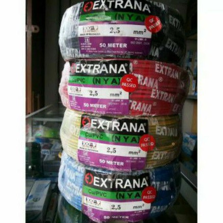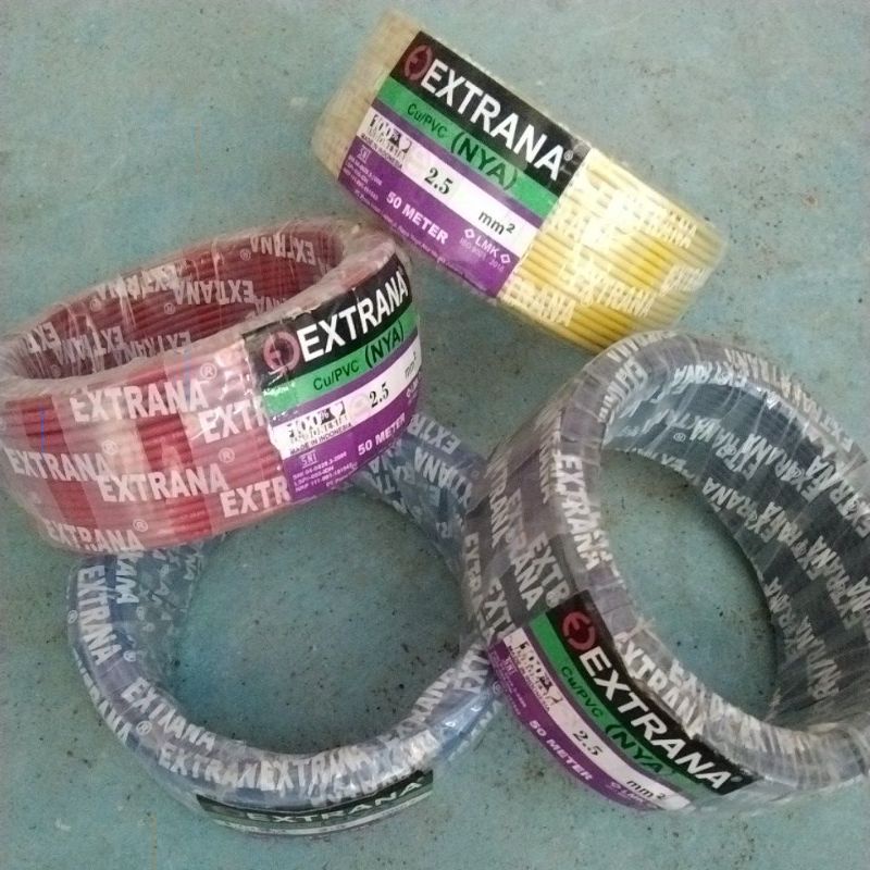 Kabel NYA Merek Extrana ukuran 1x2,5 mm 1 Roll memiliki panjang 50 Meter Berkualitas Warna Bervariasi Tembaga Murni Tersertifikasi Standard Nasional Indonesia