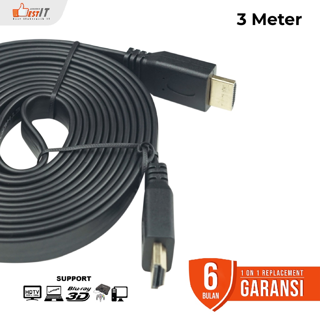 Kabel HDMI Flat M-Tech V1.4 - Panjang 3 Meter - 24K Gold Plated - Konektor male to male - Support 1080P, 1440P, 1600P - Full HD 1080P - Speed up to 10.2Gbps