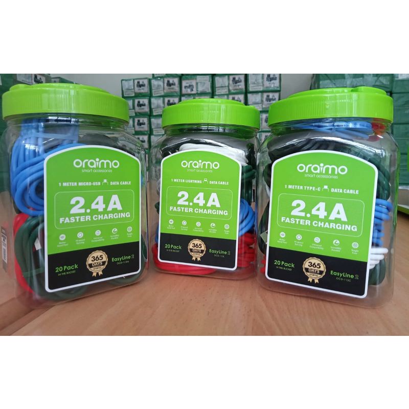 Spesifikasi : Brand : Oraimo Current : 2.4A Material : PVC Lenght : 1M Amount : 1pcs Color : White , Red , Black , Blue , Green