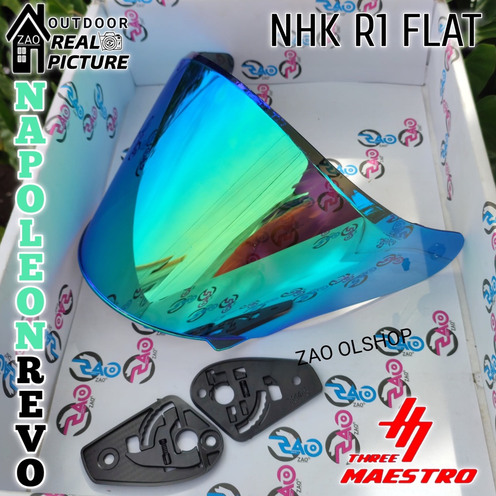 Isi Paket : *1 pcs Kaca FLAT Open VENOM merk ThreeMaestro R-1 Series *1 set (2pcs) Rachet nya Visor TM-04 Venom dari "Three Maestro"