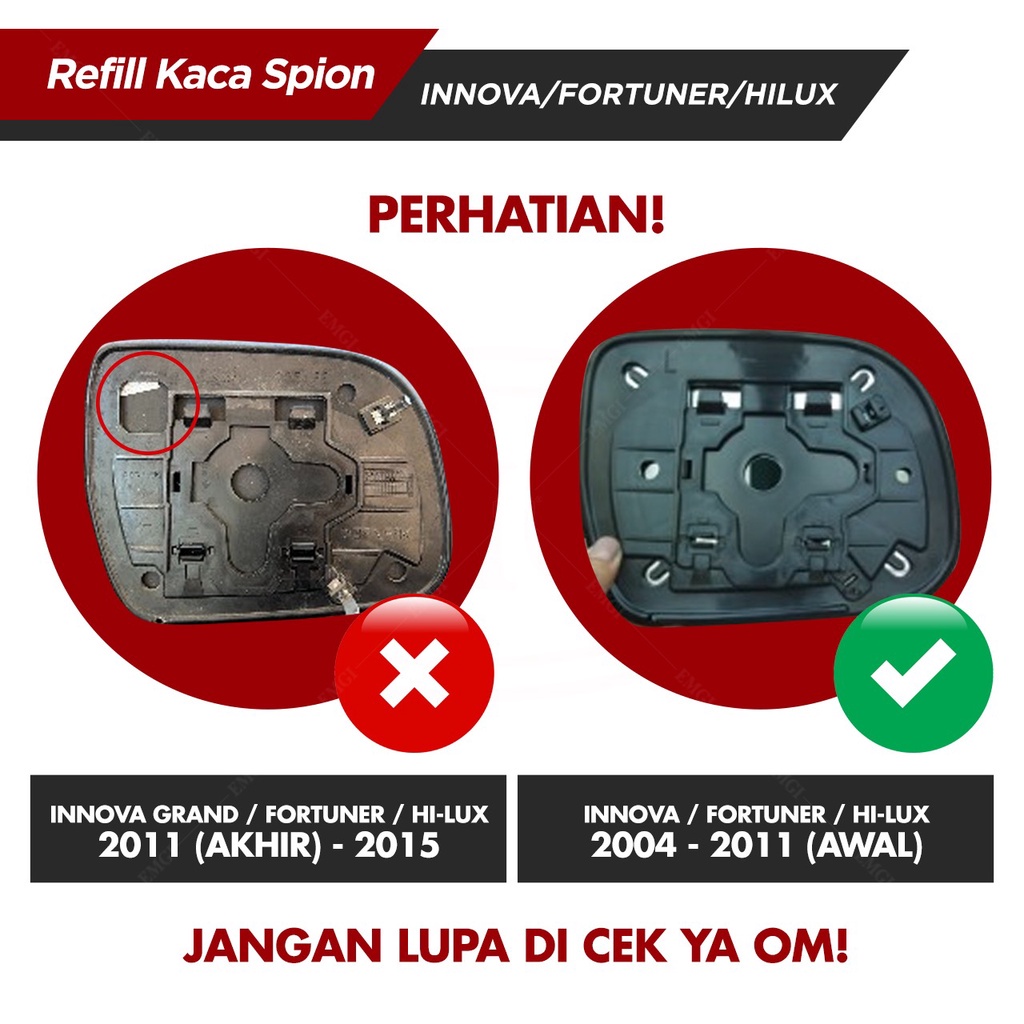 - Warna: Putih (standard) - Model: Cembung (standard) - Harga untuk 1 pc (kanan ATAU kiri) - Cocok untuk spion model elektrik - Jenis mobil: INNOVA (2004 - 2011 awal) FORTUNER / HILUX (2006 - 2011 awal)
