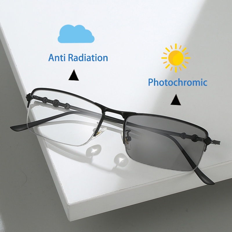 Detail Kacamata Anti Radiasi Photochromic Bisnis Persegi Panjang Untuk Pria Lensa Setengah Bingkai Dapat Diganti