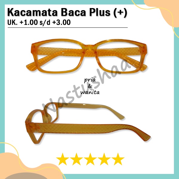 KACAMATA PLUS kacamata plus ini diperuntukkan untuk orang yang menderita gangguan penglihatan jarak dekat atau hipermetropi.Jenis lensa kacamata plus ini lebih banyak digunakan untuk beraktivitas di dalam ruangan seperti untuk membaca. Spesifikasi : Gender : Pria dan Wanita ( UNISEX) Warna Frame : Orange Bentuk Frame : Persegi Panjang Bahan Frame : Plastik Bahan Lensa : Mika Jenis Lensa : Lensa Baca Plus