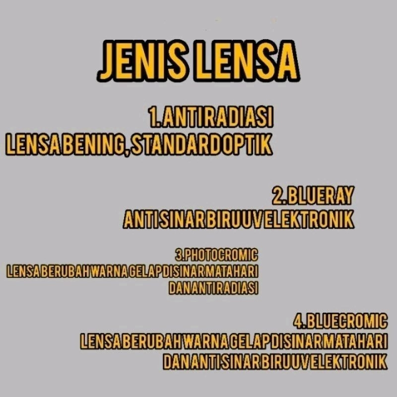 Frame : 9011 • PERHATIKAN) YANG BISA DI BUAT MINUS/SILINDER HANYA UNTUK PAKET ANTIRADIASI DAN PAKET BLUERAY DAN PAKET PHOTOCROMIC DAN PAKET BLUEYCROMIC.. TULIS MINUS/SILINDER NYA DI CATATAN ATAU DI CHAT. JIKA TIDAK NGASIH UKURAN MINUS/SILINDER AKAN KAMI KIRIM LENSA NORMAL