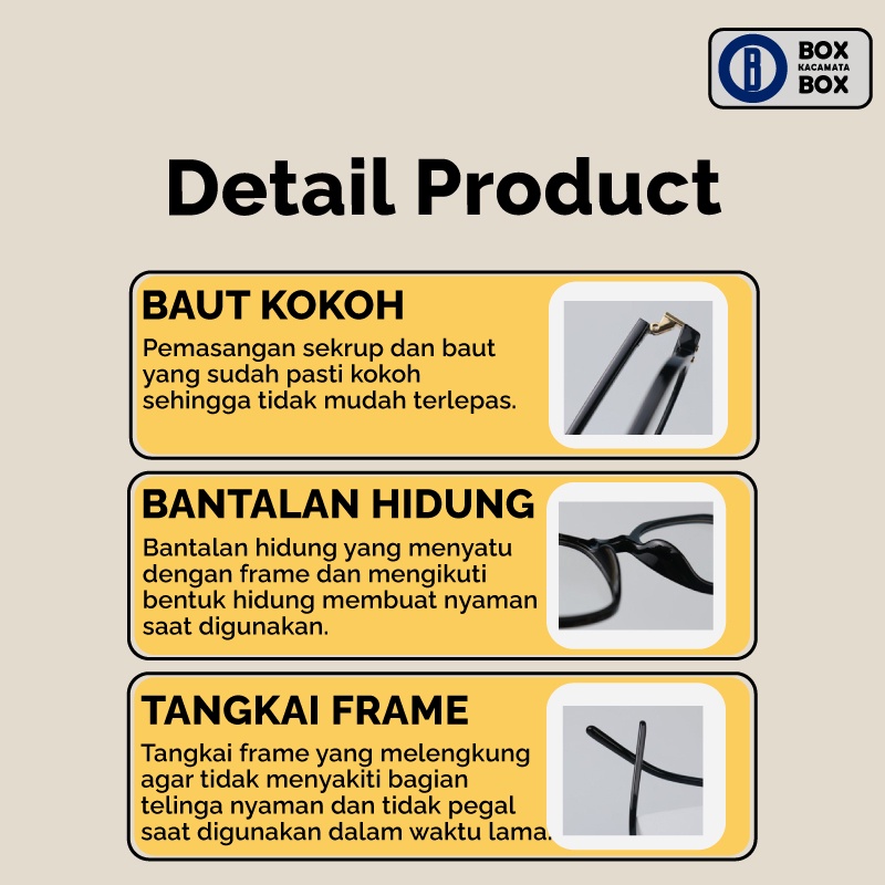 Frame kacamata dengan bentuk kotak yang sangat ringan dan kokoh. memiliki beberapa warna pilihan yang sangat cocok digunakan baik untuk pria ataupun wanita. terdapat design dots pada ujung sudut frame dan di bagian tangkai yang senada dengan warna frame nya. Material nya yang ringan dan bisa di pakai dalam jangka waktu yang lama